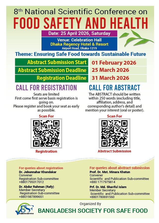 Conference Bangladesh Society for Safe Food THE SOCIETY WILL INTENSIVELY WORK ON DIFFERENT ASPECTS OF SAFE FOOD IN BANGLADESH. CLICK HERE FOR ABSTRACT SUBMISSION CLICK HERE FOR REGISTRATION 7th International Scientific Conference on Food Safety and Health 2025 has been held on 10th May, 2025Bangladesh Agricuture Research Council, BARC